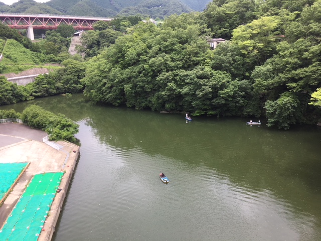 吉野橋の下が沢井川。その沢井川では船釣りで魚を釣っている人達がいらっしゃいます。おっ、ここに「一橋大学相模湖艇庫合宿所」と書かれた看板の立派な建物があります。一橋大学ボート部の合宿所のようです。沢井川はこのすぐ下流で相模湖になります。