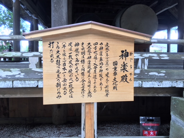 文政10年(1827年)造営された神楽殿(国の重要文化財)です。殿内に神楽殿建立と同時に奉納された大太鼓があります。この大太鼓は一枚皮が使われ、一枚皮では日本一のものとのことです。また、この大太鼓は元旦の朝にのみ打つことになっているのだそうです。