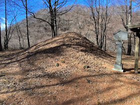 江戸の日本橋から数えて51里目の「唐沢一里塚」です。この唐沢一里塚は、江戸時代中期に中山道の経路が川沿いに移ったため、このカラマツ林の山中に手つかずのままひっそりと取り残されたもので、天保2年(1831年)の記録では、既に中山道の路線からは外れていたのだそうです。既に塚上の木は失われていますが、左右の塚がほぼ原形をとどめている珍しい一里塚です。まさに時を越えて江戸時代にタイムスリップしたかのような貴重な貴重な一里塚です。私達はこの唐沢一里塚を見るために、この区間は旧中山道ではなく、敢えて中山道が整備された当時の (経路が変更になる前の) 古中山道を辿ったわけです。一里塚の付近には「御嶽大権現」の石碑などが並んで立っています。